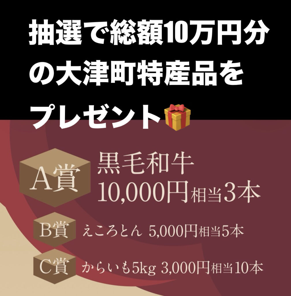 からいもを使用した商品を対象店舗で1,000円以上飲食、お買い物いただくと、大津特産の賞品が当たるキャンペーンに応募できます。
